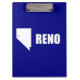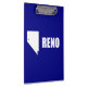 Clipboard with flag of city of Reno, Nevada; blue flag with white shape of Nevada with star symbolizing Reno’s location inside the state