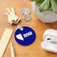 Button Keychain with flag of city of Reno, Nevada; blue flag with white shape of Nevada with star symbolizing Reno’s location inside the state