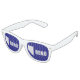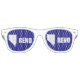 Sunglasses with flag of city of Reno, Nevada; blue flag with white shape of Nevada with star symbolizing Reno’s location inside the state