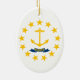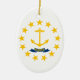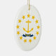 The flag of the state of Rhode Island, United States, is white and consists of a gold anchor in the centre (a symbol for hope) surrounded by thirteen gold stars (for the original Thirteen Colonies and Rhode Island's status as the 13th state to ratify the Constitution). A blue ribbon below the anchor bears the state's motto in gold: "HOPE". The flag is frequently depicted with golden fringe around the edges of the flag, although the fringe is never actually on the flag unless it is used in federal-level displays, much like the national flag