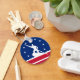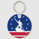 Button Keychain with flag of city of Richmond, Virginia; blue flag with red and white stripes, with white stripes and silhouette of man working James river bateau down the James river