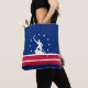Tote bag with flag of city of Richmond, Virginia; blue flag with red and white stripes, with white stripes and silhouette of man working James river bateau down the James river