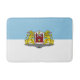 Bath mat with design with flag of Riga, capital city of Latvia; white and blue flag with coats of arms with two golden lions holding a shield in the centre