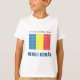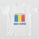 Isolated pixelated flag of Romania with text: Blue. Yellow. Red. Forever Romanian