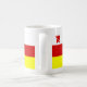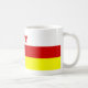 Mug with flag of city of Santa Barbara, California; flag with vertical tricolor of white, red and yellow, with illustration of a red fort in the upper left corner