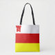 Tote bag with flag of city of Santa Barbara, California; flag with vertical tricolor of white, red and yellow, with illustration of a red fort in the upper left corner