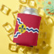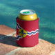 Can Cooler with flag of city of St. Louis; red flag with white and blue waves and blue fleur-de-lys in yellow circle