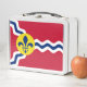 Lunch Box with flag of city of St. Louis; red flag with white and blue waves and blue fleur-de-lys in yellow circle