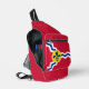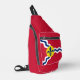 Sling Bag with flag of city of St. Louis; red flag with white and blue waves and blue fleur-de-lys in yellow circle