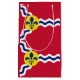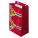 Paper bag with flag of city of St. Louis; red flag with white and blue waves and blue fleur-de-lys in yellow circle