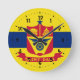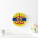 Clock with flag of city of St Paul, Minnesota; flag with three horizontal stripes of blue and yellow with red emblem in the centre