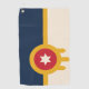 Golf Towel with a design with the flag of Tulsa, Oklahoma. A beige and navy blue flag with a gold Osage shield containing a red circle and a beige six-pointed star