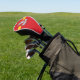 Golf driver cover with design with flag of Vilnius, capital city of Lithuania; red flag with yellow stripe and coats of arms with two golden lions holding a shield in the centre