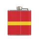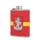 Vinyl wrapped flask with design with flag of Vilnius, capital city of Lithuania; red flag with yellow stripe and coats of arms with two golden lions holding a shield in the centre