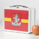 Metal Lunchbox with design with flag of Vilnius, capital city of Lithuania; red flag with yellow stripe and coats of arms with two golden lions holding a shield in the centre