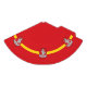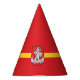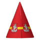Party Hat with design with flag of Vilnius, capital city of Lithuania; red flag with yellow stripe and coats of arms with two golden lions holding a shield in the centre