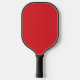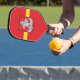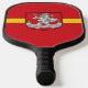 Pickleball paddle with design with flag of Vilnius, capital city of Lithuania; red flag with yellow stripe and coats of arms with two golden lions holding a shield in the centre