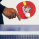 Ping pong paddle with design with flag of Vilnius, capital city of Lithuania; red flag with yellow stripe and coats of arms with two golden lions holding a shield in the centre