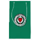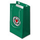 Paper bag with flag of city of Worcester, Massachusetts; green flag with white emblem with red heart in the centre