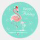 Design élégant avec une touche rétro, avec un flamant rose festif portant un chapeau de Père Noël rouge, des étoiles et des palmiers décorés de billes dressées contre un arrière - plan d'aqua. Un design personnalisable pour personnaliser avec votre propre texte, images et idées. Une image d'art numérique originale créée par Quirky Chic.