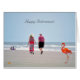 Flamant rose et couple marchant le long de la plage Happy Retirement Card. Le texte peut être personnalisé.