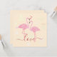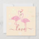 Flamants roses amoureux des coeurs et du mot "amour" dans la typographie de script qui recouvre des éléments tropicaux. Au verso de la carte "Je t'aime plus chaque jour".