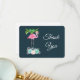 Une carte de remerciements avec l'illustration d'un flamand rose avec des palmiers verts derrière et un bouquet succulent fleuri et décoratif en contrebas. Tropical et joli. L'arrière - plan est bleu foncé.