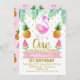 Flamant rose tropical Premier anniversaire Invitation Cute flamingo première invitation d'anniversaire avec une douce aquarelle flamingo, un peu de feuillage, des tranches de pastèque et des ananas. Le titre est une fausse texture de feuille d'or et ne peut pas être modifié. La conception de l'invitation pour le premier anniversaire de cette mignonne fille est sûr de préparer le décor pour la prochaine fête d'anniversaire de votre petite fille. D'autres articles de cette conception sont disponibles au magasin.