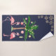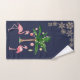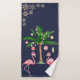 Flamants roses en caricature avec chapeau de Santa et flocons d'or sur arrière - plan bleu.