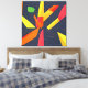 This canvas print showcases an abstract play of angular shapes in fiery tones of red, orange, and yellow, contrasted with a dark background and flowing linear patterns. The dynamic mix of geometric shards and organic swirls evokes both motion and balance, making it an eye-catching addition to modern or eclectic interiors.