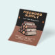 A promotional flyer featuring a stack of split firewood logs, orange flames icons and wood grain-textured text.