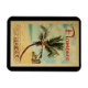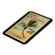 A uniquely retro mid-century modern Flamenco Puerto Rico art print in vintage travel poster style. It features a curved palm tree on sandy beach with ocean under a blue cloudy sky.