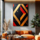 Energetic geometric abstraction! Diamonds and triangles in black, gold, and intense red, with textures adding depth. A visual explosion blending mathematical rigour and chromatic passion—ideal for modern art lovers seeking bold contrasts.