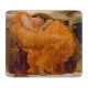 This design features a painting by the British artist Sir Frederic Leighton (1830–1896), who was famous for his works depicting historical, biblical, and classical scenes in an academic style. This painting shows a stunningly beautiful woman wearing a diaphanous red dress as she is curled up asleep. Some art historians have said that the toxic oleander branch in the top right could symbolize the fragile link between sleep and death. The rich colours and the elegantly recreated marble surround are characteristic of Leighton's realistic style, as is his lifelike use of natural light. This painting is widely considered to be Leighton's magnum opus and it was completed in 1895; it is currently housed in the Museo de Arte de Ponce, Puerto Rico.