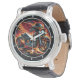 This close-up image features a unique watch face with a vibrant, action-packed illustration. A custom trike, engulfed in vivid orange and yellow flames, dominates the design. The dark background accentuates the fiery motif, while silver numbers and watch hands maintain functionality, creating a bold and energetic accessory for motorcycle enthusiasts.