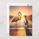 A surreal scene capturing a flamingo and penguin side by side, casting long shadows on a shimmering waterfront at sunset.