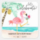 Fun, festive birthday party stickers feature a pink flamingo on the beach enjoying a tropical cocktail next to a palm tree with a "let's celebrate" caption in modern, casual handwriting script. Art by KL Stock