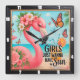 This vibrant square wall clock features a cheerful pink flamingo adorned with tropical flowers, enjoying a sunny beach scene with fluttering butterflies. The playful text "GIRLS JUST WANNA HAVE Sun" and a refreshing drink complete this whimsical design, making it a perfect, fun accessory for any room.