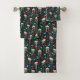 This elegant flamingo bird pattern bath towel and washcloth set has an original design made in a retro 20s Art Deco style. The bright pink flamingos rest against a background that includes fern fronds in bold colors and geometric rectangular shapes in shades of teal green / turquoise blue, all on a backdrop of black. This pretty, stylized design is perfect for anyone who loves these tropical animals and is looking for an elegant pattern with a retro 1920s twist.