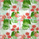Watercolor pattern design with flamingo flowers and birds, monstera and palm leaves.