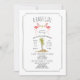 A baby shower invitation featuring an illustration of two flamingos holding bunting. Invite also features an illustration of an island with palm trees. Personalize the text.