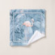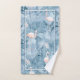 This towel set features a gorgeous pattern of flamingos surrounded by abundant tropical foliage and orchids in dusty blue and blush pink. Striped borders are optional and can be moved or deleted if preferred. Search ID868 to see other products with this tropical pattern.