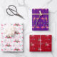 Flamingos gift wrapping paper for the holidays. Pink flamingos stand among blue sea stars on three large sheets of wrapping paper. The flamingos wear festive wreaths of hibiscus flowers and holly leaves. Paper colours are white, purple and red and have varying flamingo designs. One has “Seas and Greetings” wording in the pattern.