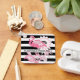 The product design features a flamingo with kaleidoscopic paisley patterns in shades of pink over black and white stripes background. This tropical bird design with personalized text makes a modern and unique keychain.