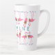 Tropical flamingos tall mug for a coastal themed kitchen. Pink flamingoes stand among little blue starfish with one row along the bottom and the other upside-down at the top. If you choose the smaller mug size the starfish will be cut off.
