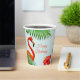 Flamingos, hibiscus and palm leaves on light blue paper cups