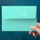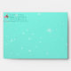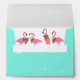 Tropical Christmas envelopes decorated with pink flamingos. Pretty turquoise coloured felt paper has twinkling stars background. Add a return address on the front using the text template. Inside, under the flap four big flamingos stand with holiday wreaths around their necks.