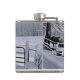 Une scène de neige en hiver paisible avec un cheval dans le pâturage, et une cardinale rouge vif et une couronne sur la porte.