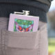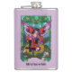 Une fée aux cheveux noirs tout en rouge et violet assis sur un champignon. Feuilles et champignons à l'homme vert bordent la fée