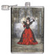 Rendu numérique 3D d'une belle sorcière féminine dans une robe rouge et noire avec des ailes sur un imaginaire éffrayant château arrière - plan